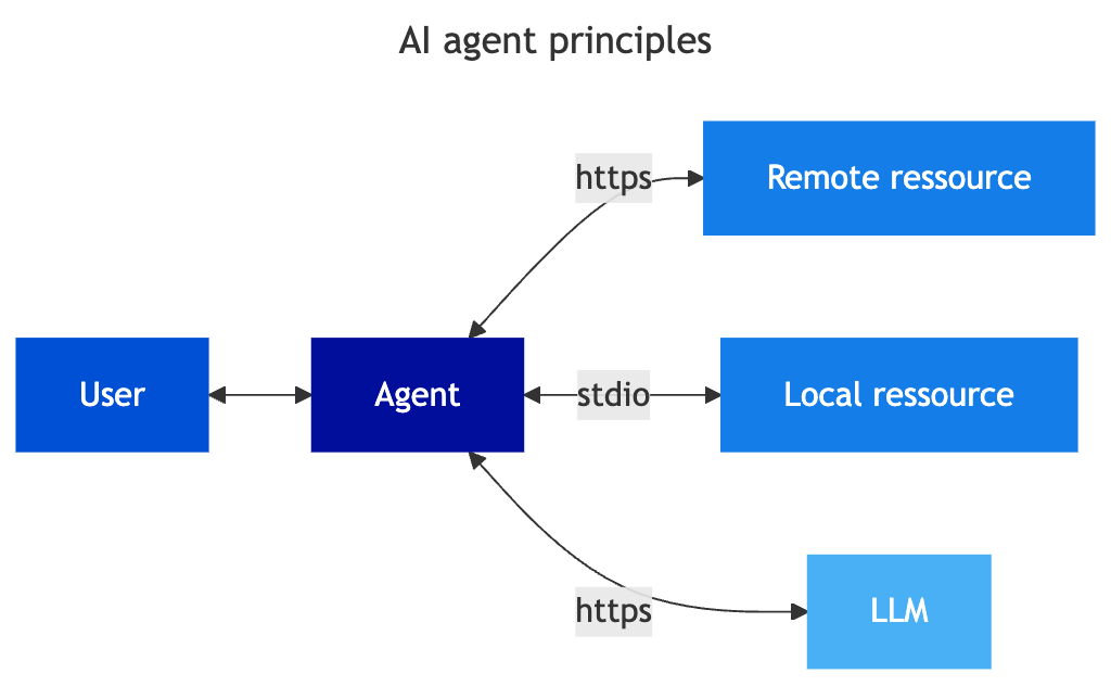 Remote agents, like local agents, are applications that connect different resources (LLM, RAG, third-party services), packaged within a web application, accessible to the user through their browser. All chatbot services are gradually integrating these capabilities to enrich their service by connecting to third-party services. The operation is similar to local agents, but outside the user’s workstation.