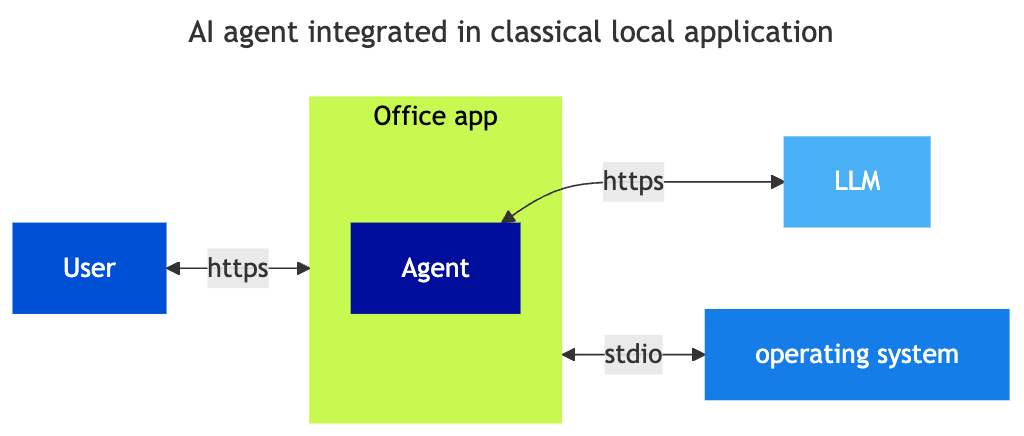 Applications are gradually being enriched with the ability to connect to an LLM service. Generally, this is done via APIs to LLM services or locally on the machine. In this case, the application will integrate an agent and incorporate its use into the usual application experience. The framework is equivalent to that of an enriched SaaS application, but the configuration and calls to the LLM are made from the user’s workstation. The functionality can be native or installed in the form of a plugin.