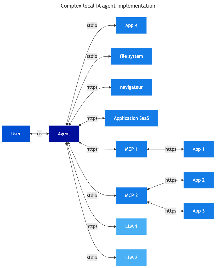 These agents can be generalist or specialised. In particular, this type of agent is widely used by developers within their IDE . In this context, security management relies on the user and the local configuration of tools. Capabilities may be extended with marketplace, like plugins to add connectors to external services or capabilities. The complexity of configurations, the lack of proven and hardened standards due to the relative novelty of these tools generates many risks, on an application directly run on user workstation, with all their rights.