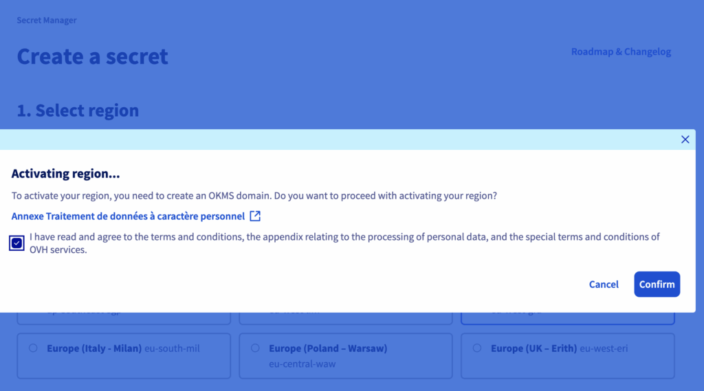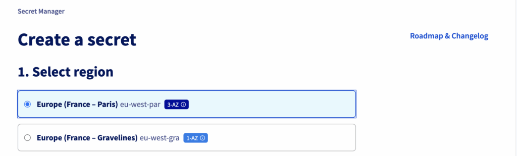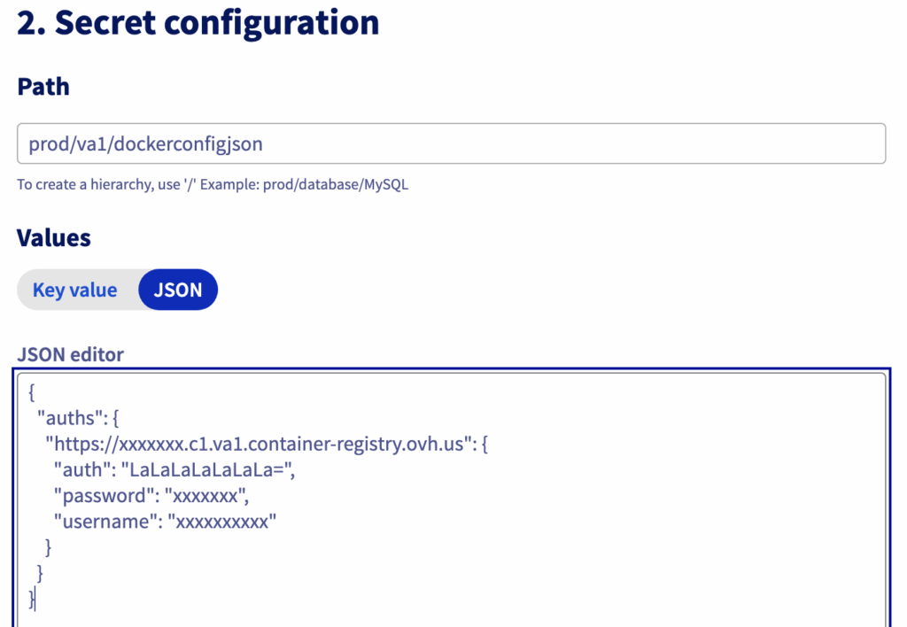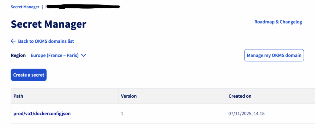 On the OVHcloud Control Panel (UI), go to “Secret Manager”, and then create a secret “prod/va1/dockerconfigjson” in the region Europe (France – Paris) eu-west-par: