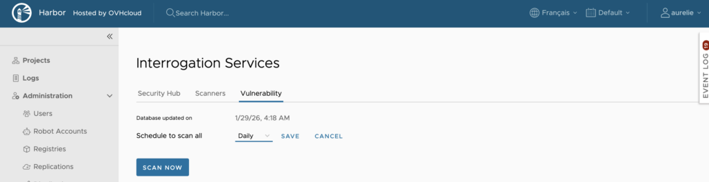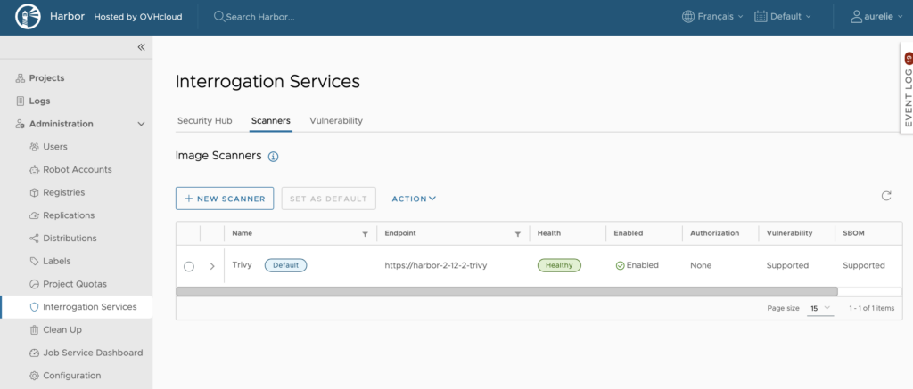 The OVHcloud Managed Private Registry uses Trivy as its default vulnerability scanner, but you can add more scanners if needed. Go to the Administration panel, click Interrogation Services, then navigate to the Scanners tab:
