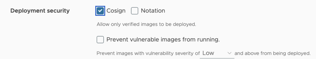 To allow only verified/signed images to be deployed on a project, click the project your image is part of, navigate to the Configuration tab, and tick the Cosign and/or Notation checkbox:
