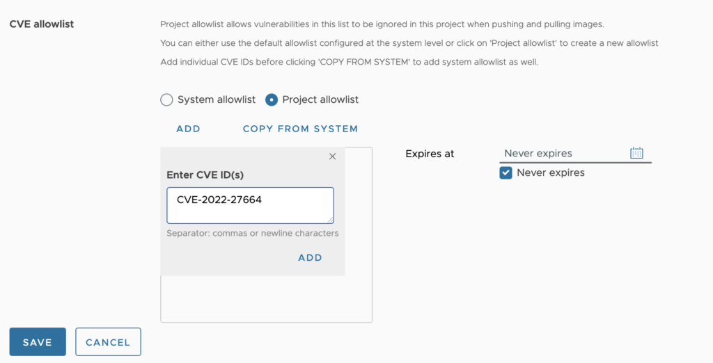 💡But the good news is that you can configure a CVEs whitelist with the list of not exploitable CVEs to ignore them during vulnerability scanning: